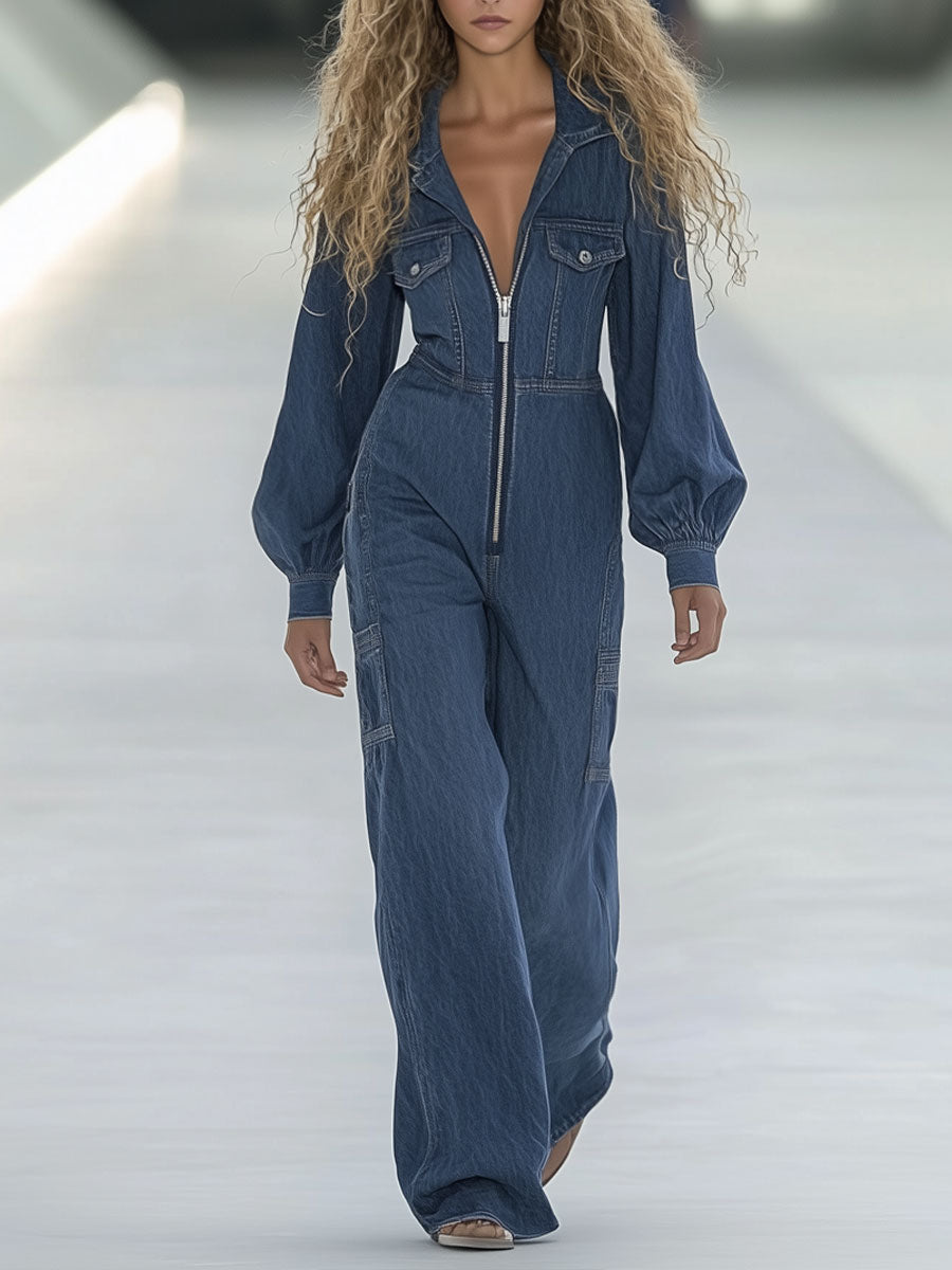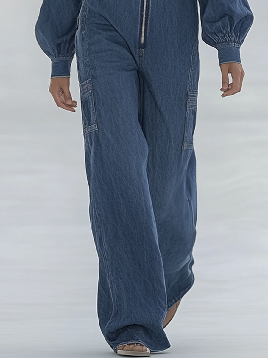 This Fashion Street Blue Washed Zipper Lapel Puff Sleeve Jumpsuit offers a bold and trendy take on classic denim wear. Crafted from blue washed denim, it features a sleek front zipper closure and a structured lapel collar that elevate its street-style appeal. The standout puff sleeves add a fashionable, feminine touch, creating a balanced silhouette that's both edgy and chic.