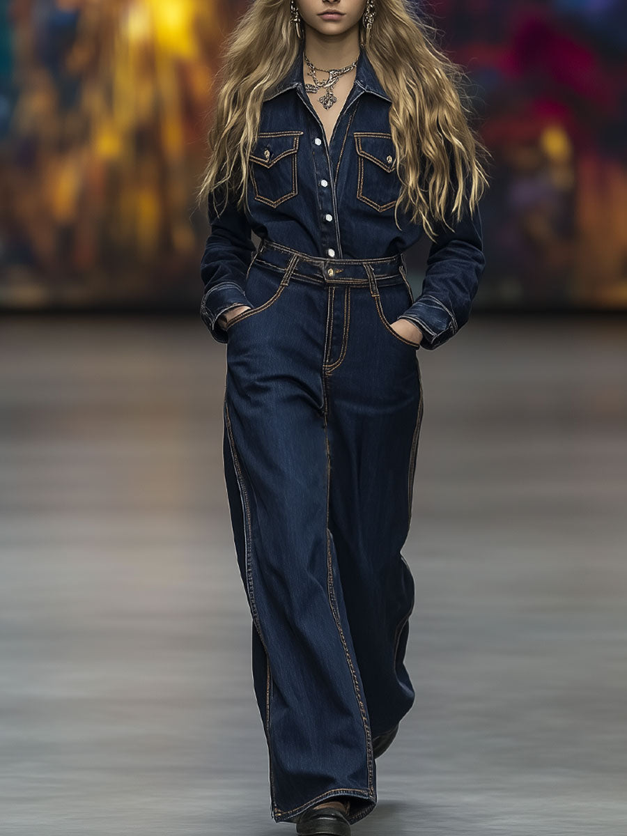 Fashionable And Casual Dark Blue Lapel Brown Topstitched Long-Sleeved Jumpsuit