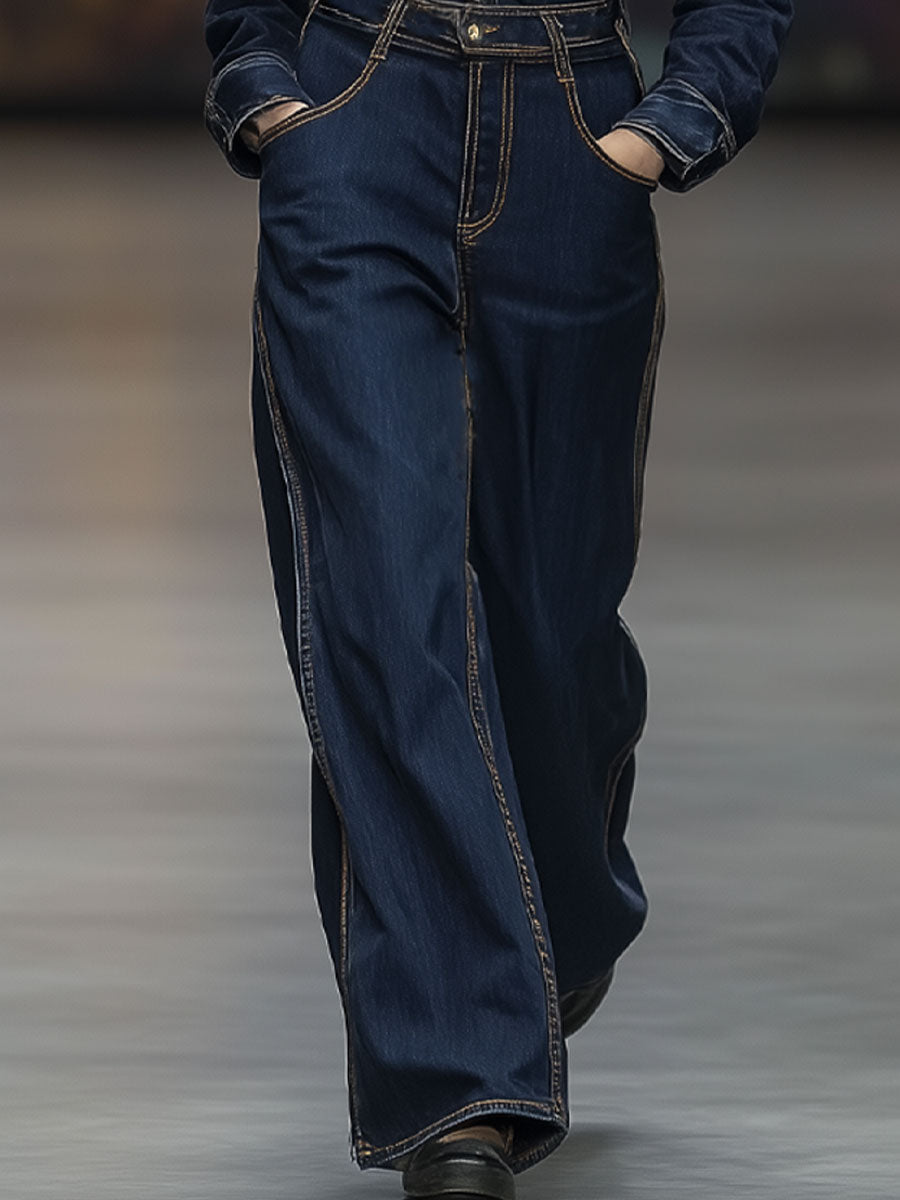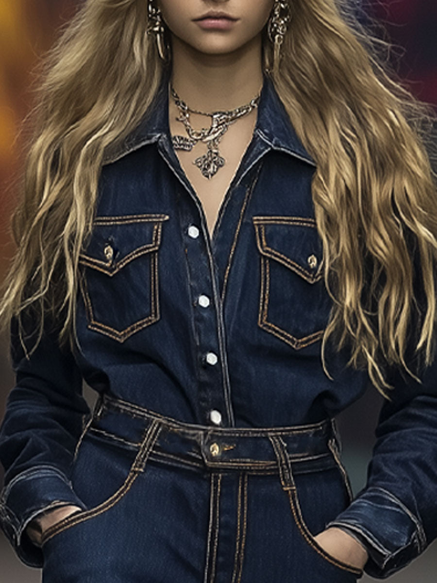 Effortlessly blending style and comfort, this dark blue long-sleeved jumpsuit is a modern wardrobe essential with a casual yet refined edge. Featuring a classic lapel collar and tailored structure, it offers a flattering, streamlined silhouette perfect for both relaxed outings and smart-casual events. The standout brown topstitching adds a subtle contrast, highlighting the garment’s clean lines and fine craftsmanship while infusing it with a touch of contemporary flair.