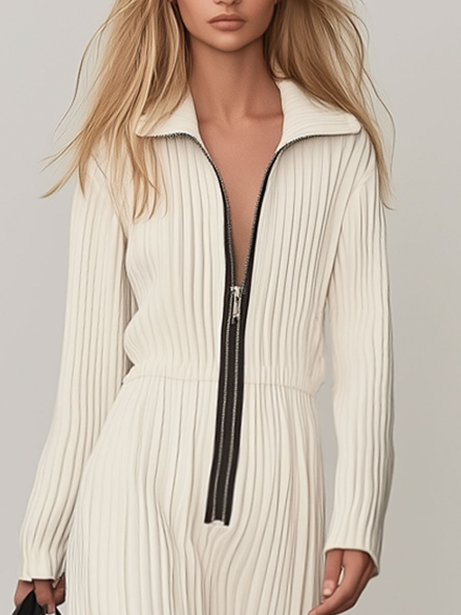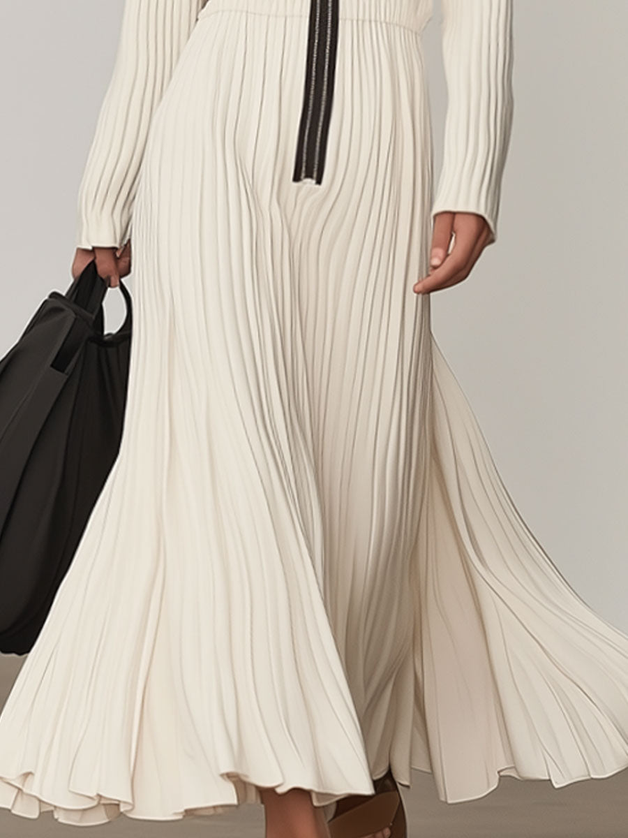 Fashionable And Casual White Knitted Lapel Long-Sleeved Maxi Dress