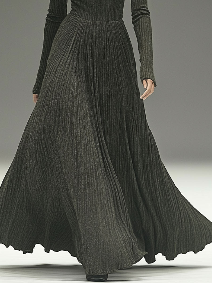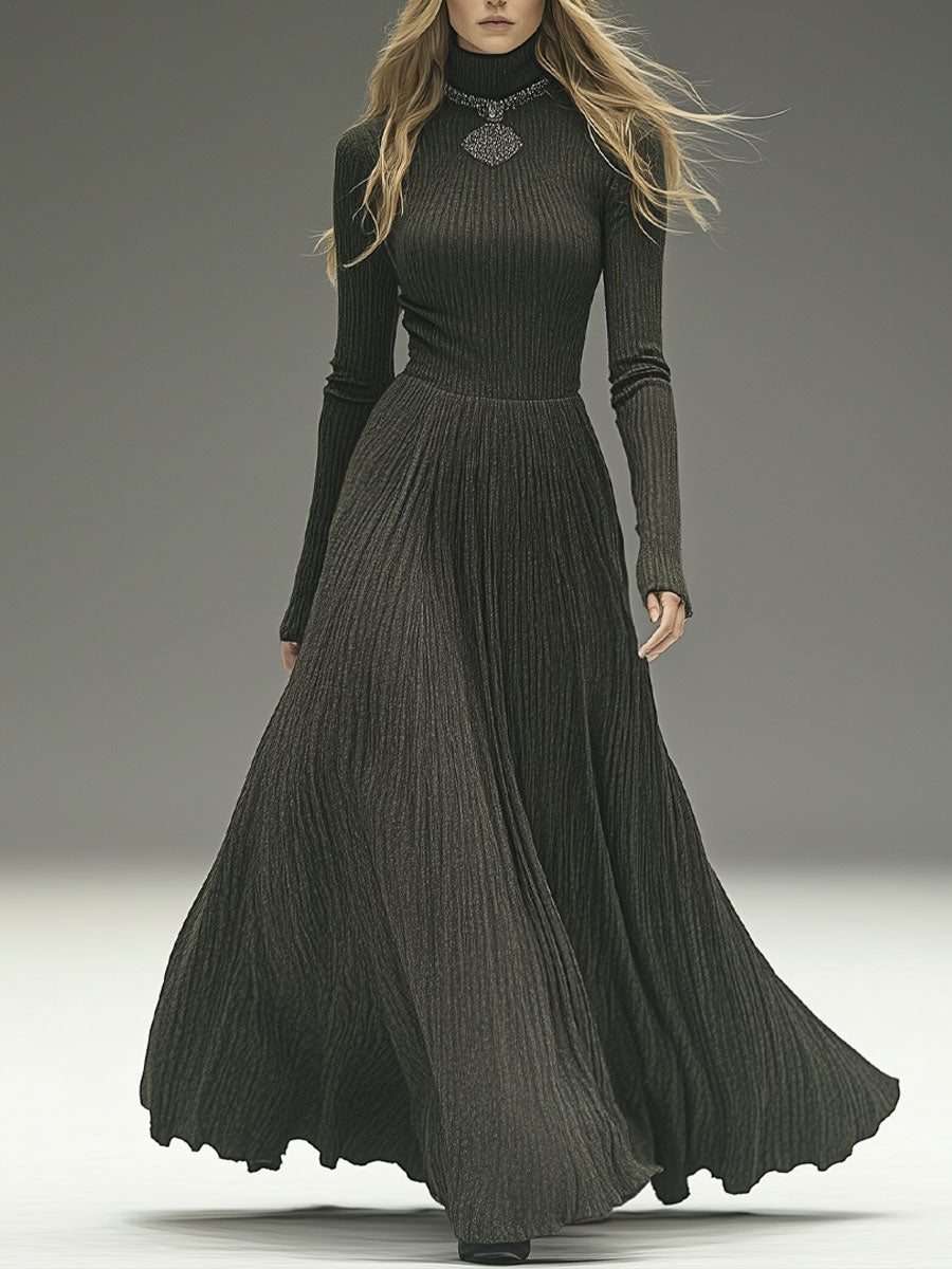 Fashionable And Elegant Gray-Green High-Neck Ribbed Woolen Maxi Dress