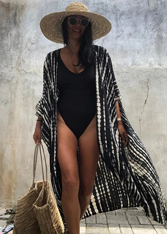 Embrace effortless beach vibes with the Monochrome Beach Kimono. This oversized, loose-fitting cover-up adds the perfect laid-back touch to your swimsuit, with a stunning black and white tie-dye design. Whether you're lounging by the water or strolling the shore, this kimono offers both comfort and style for the ultimate beach look.