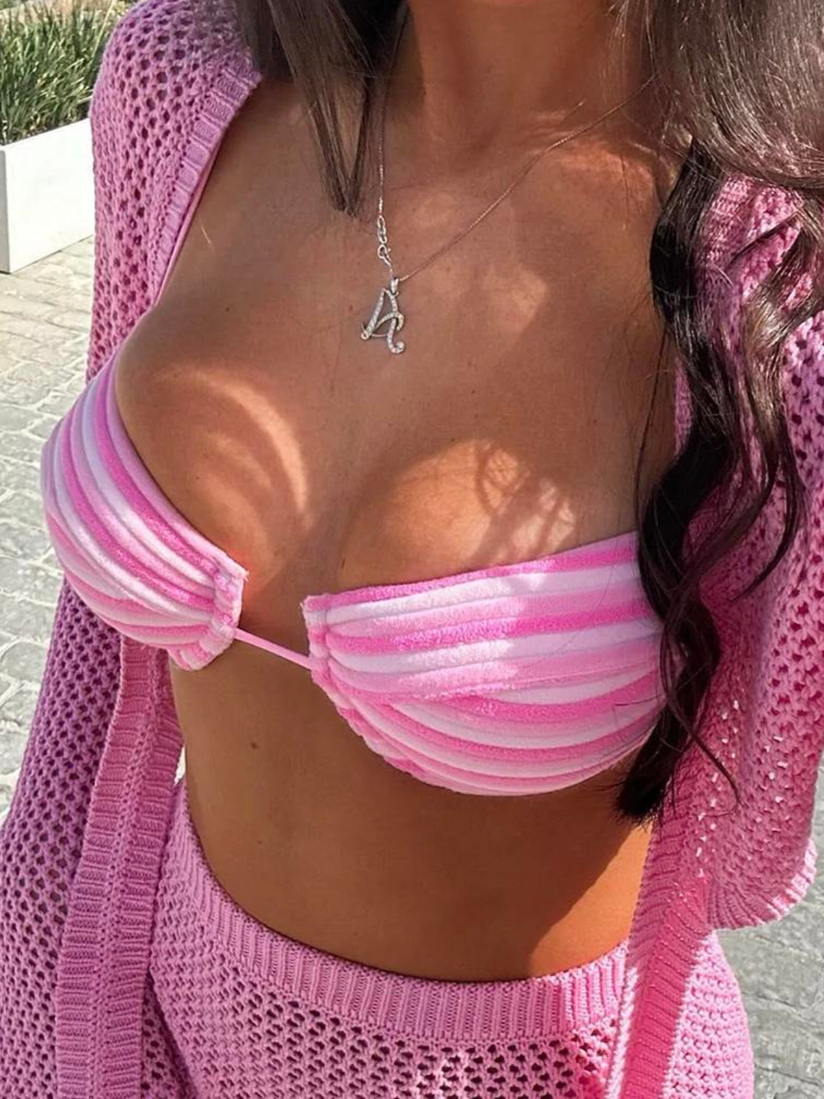 To preserve the delicate shimmer fabric of your bikini, please avoid rough surfaces such as rocks and pool edges to minimize snagging. Be cautious when wearing jewelry and bags, as they can catch on the fabric.