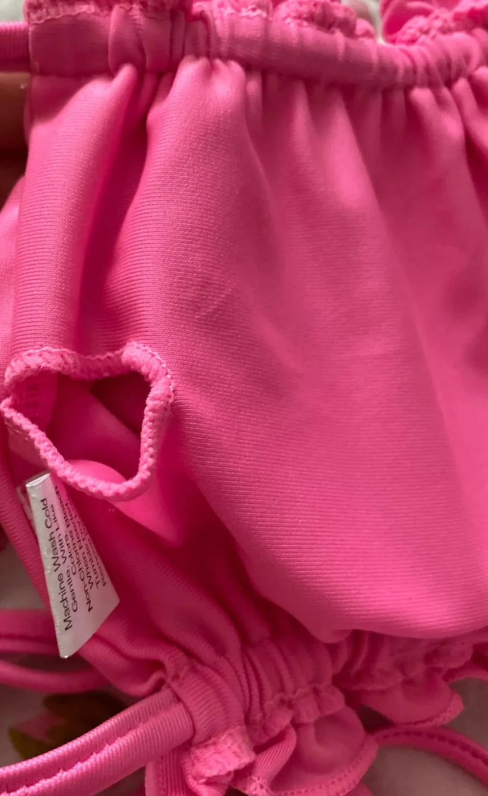 To preserve the delicate shimmer fabric of your bikini, please avoid rough surfaces such as rocks and pool edges to minimize snagging. Be cautious when wearing jewelry and bags, as they can catch on the fabric.