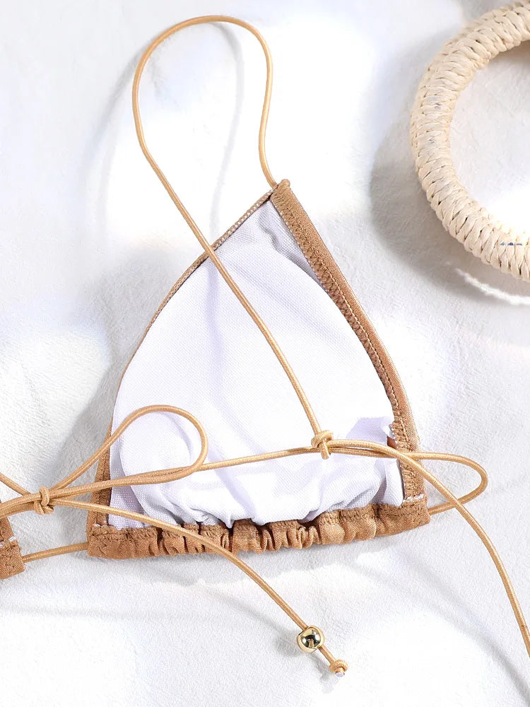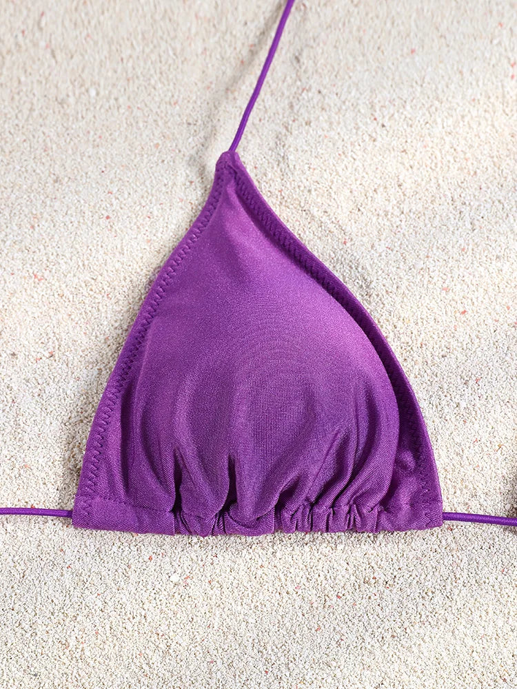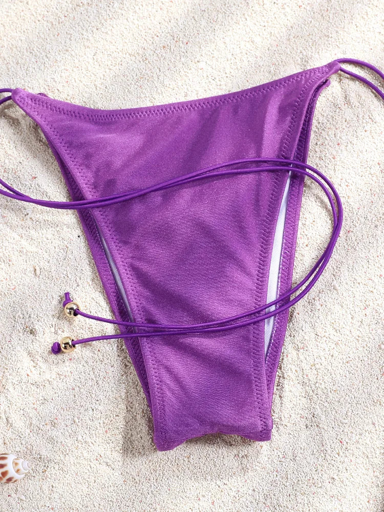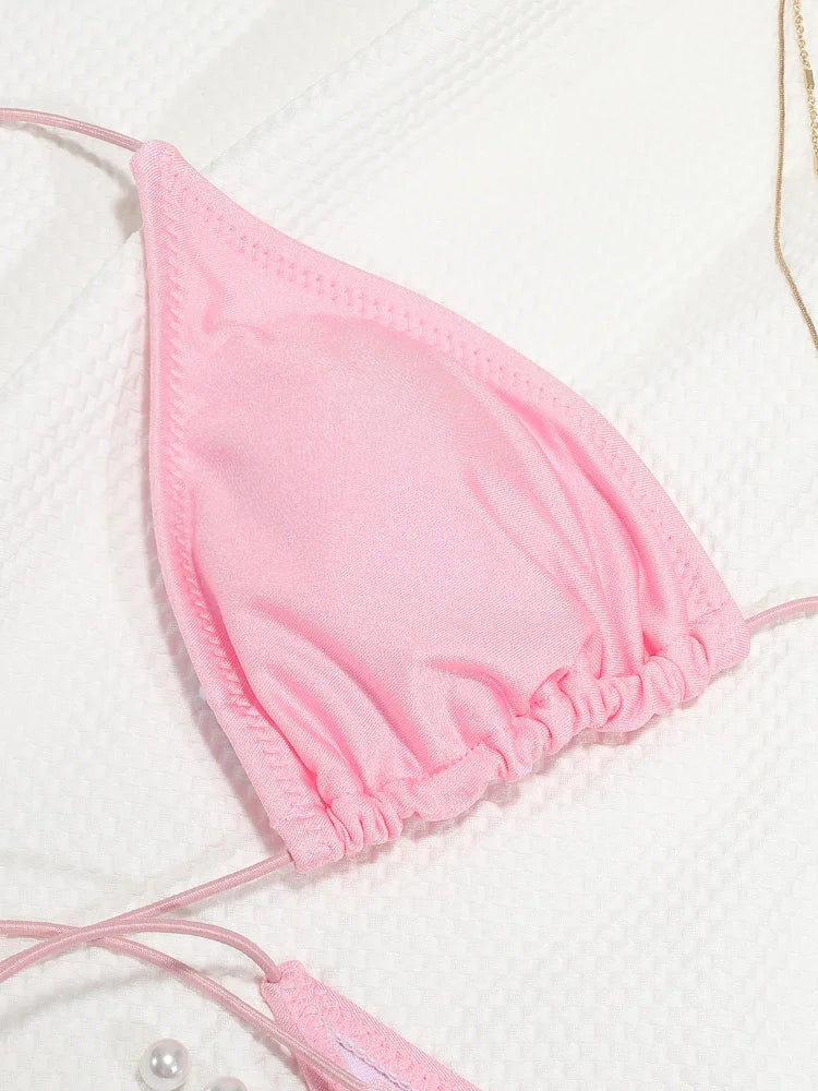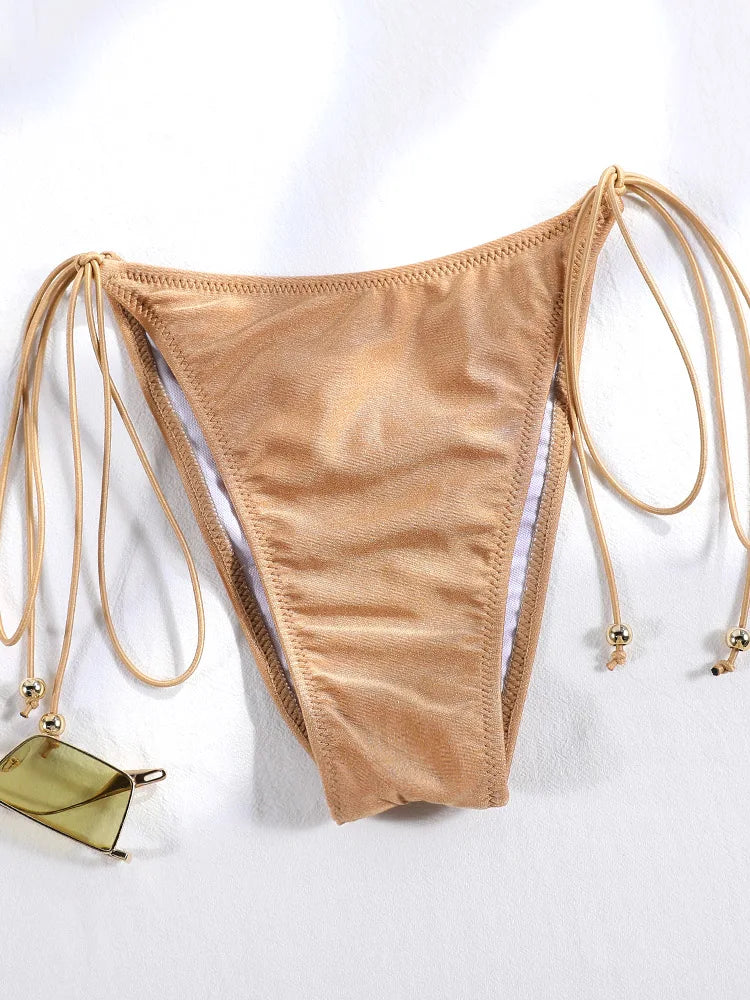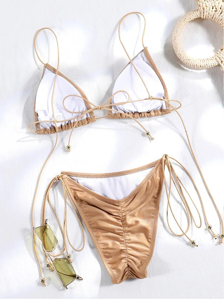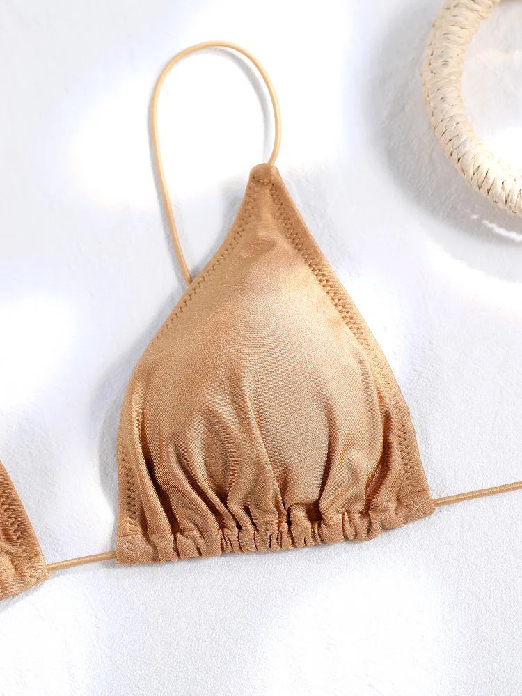 To preserve the delicate shimmer fabric of your bikini, please avoid rough surfaces such as rocks and pool edges to minimize snagging. Be cautious when wearing jewelry and bags, as they can catch on the fabric.