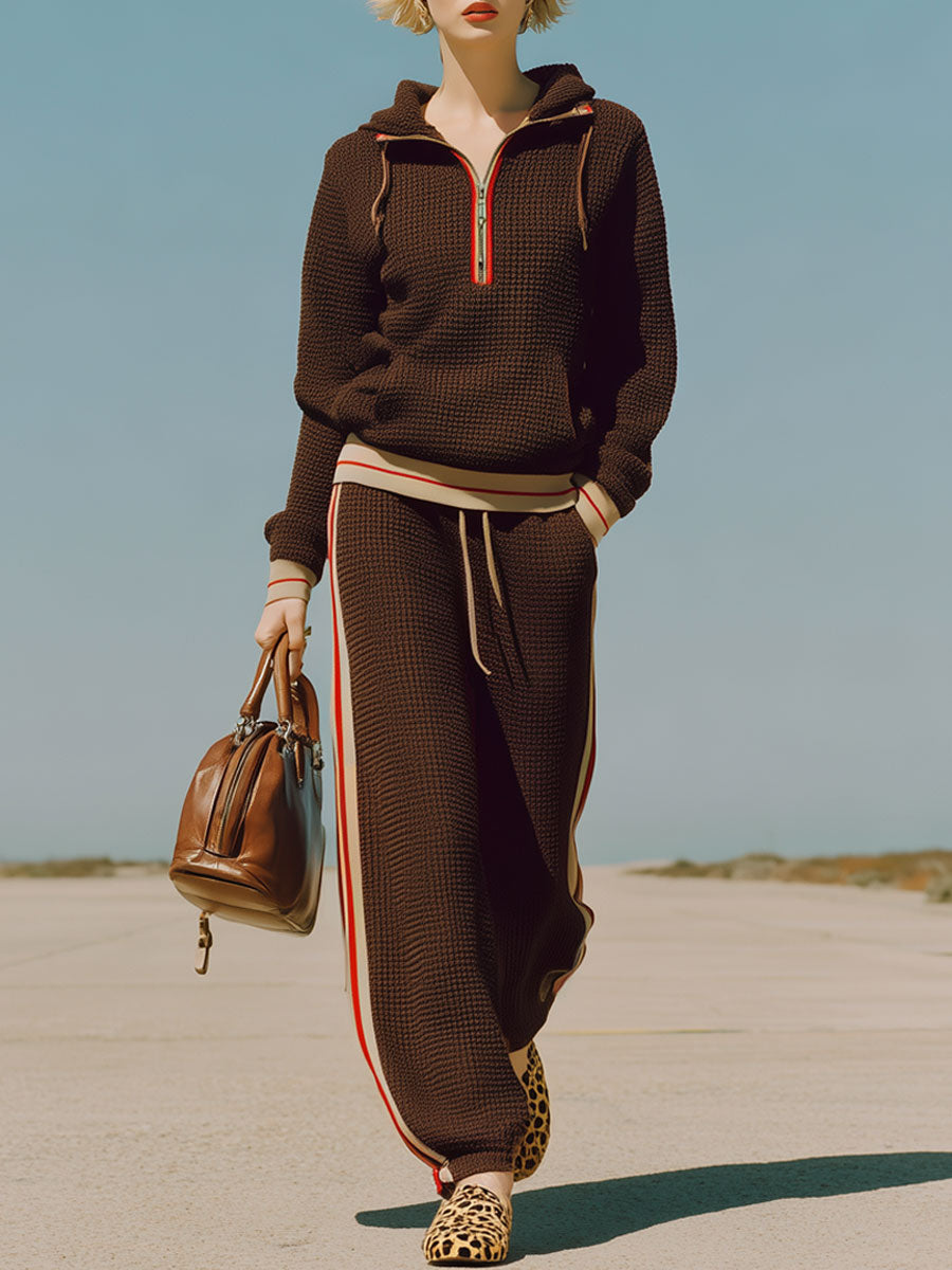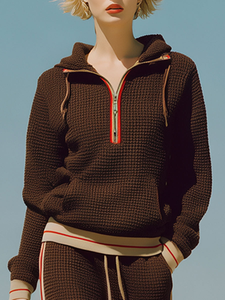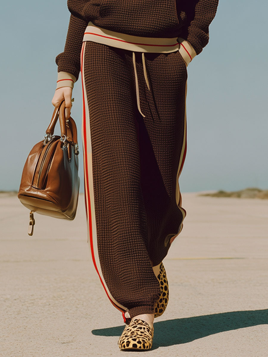 This vintage long-sleeve hooded sweatshirt and matching set in a warm cocoa brown features a textured waffle knit fabric that adds cozy warmth and retro appeal. The striped trim details along the cuffs, hem, and hood provide a subtle sporty accent, enhancing the classic yet casual vibe of the ensemble. Designed for comfort and style, the set offers a relaxed fit perfect for lounging or casual outings.