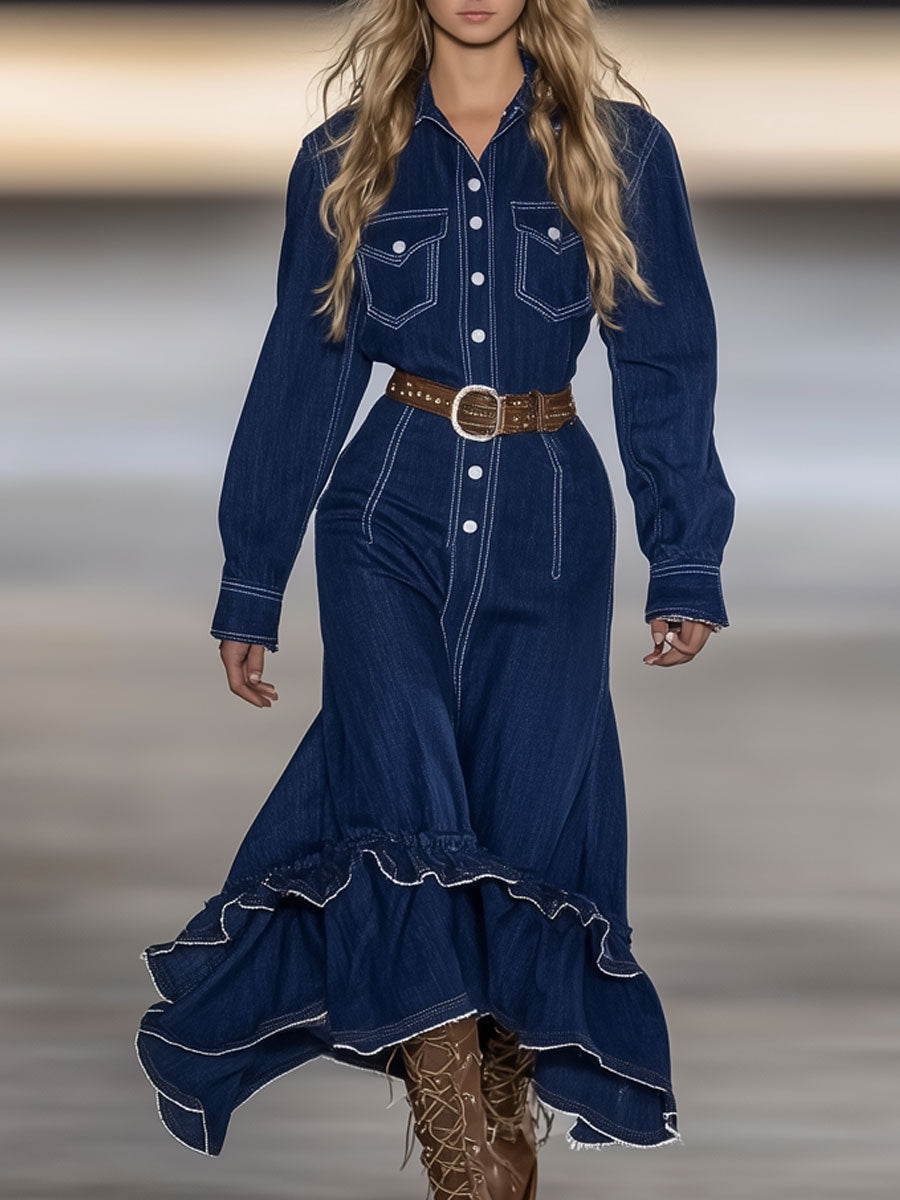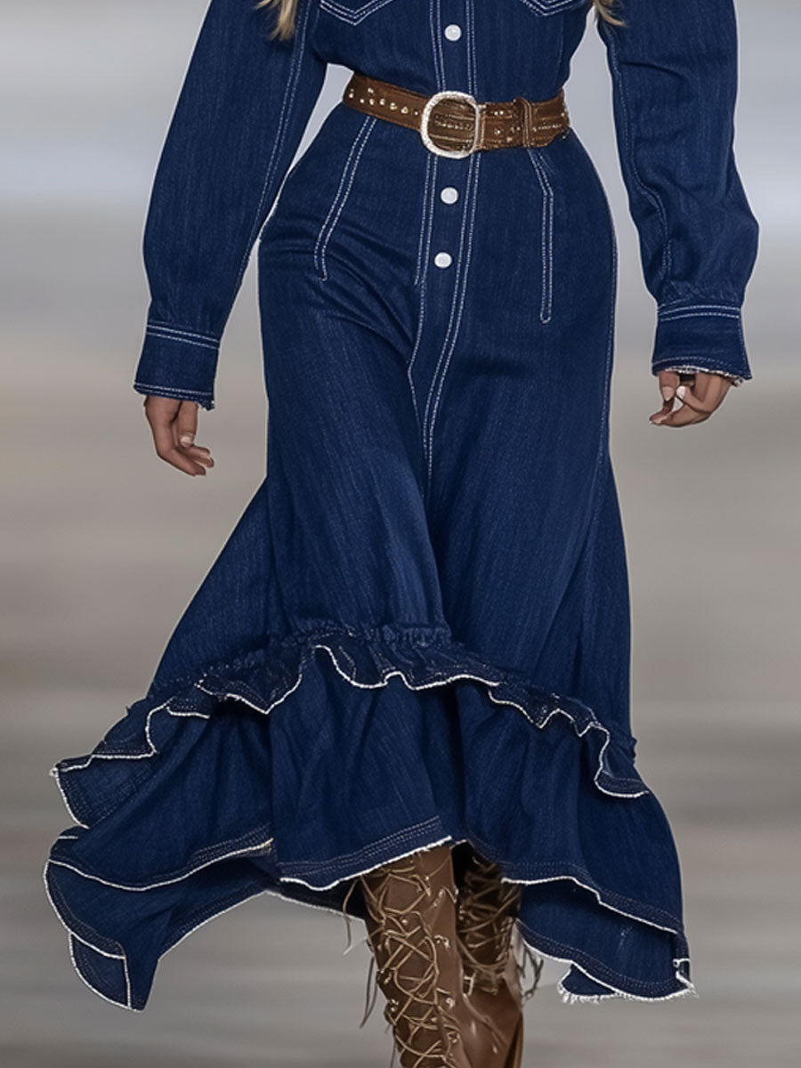 This vintage-inspired maxi dress features rich dark blue denim fabric highlighted by crisp white topstitching that accentuates its tailored silhouette. The long sleeves and flowing maxi length create a timeless look, while ruffled details along the skirt and sleeves add a soft, feminine contrast to the sturdy denim material. The combination of structured denim with delicate ruffles gives the dress a unique blend of ruggedness and elegance.