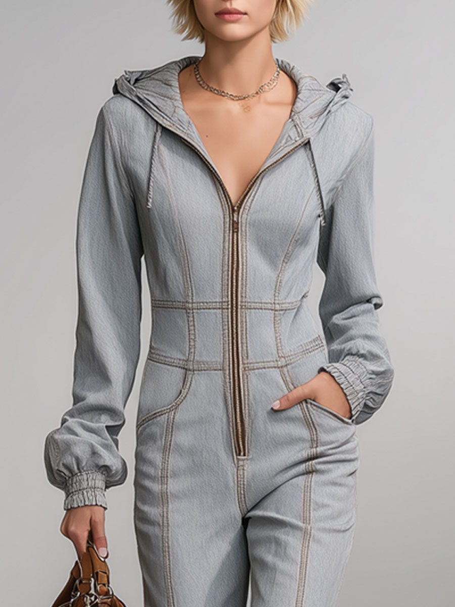 The Western Retro Hooded Gray Denim Flared Raw-Edge Long-Sleeved Jumpsuit blends casual comfort with vintage Western flair. Crafted from soft gray denim, it features a relaxed fit with flared legs and raw-edge detailing for an effortlessly edgy look. The addition of a hood and long sleeves adds a modern, laid-back touch, making it perfect for transitional weather or casual outings.