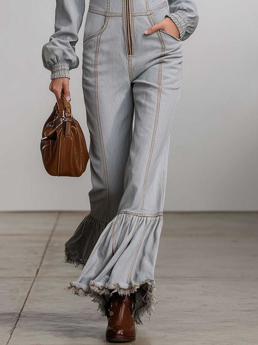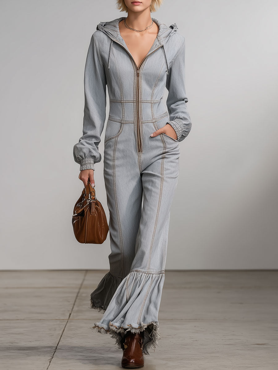 Western Retro Hooded Gray Denim Flared Raw-Edge Long-Sleeved Jumpsuit