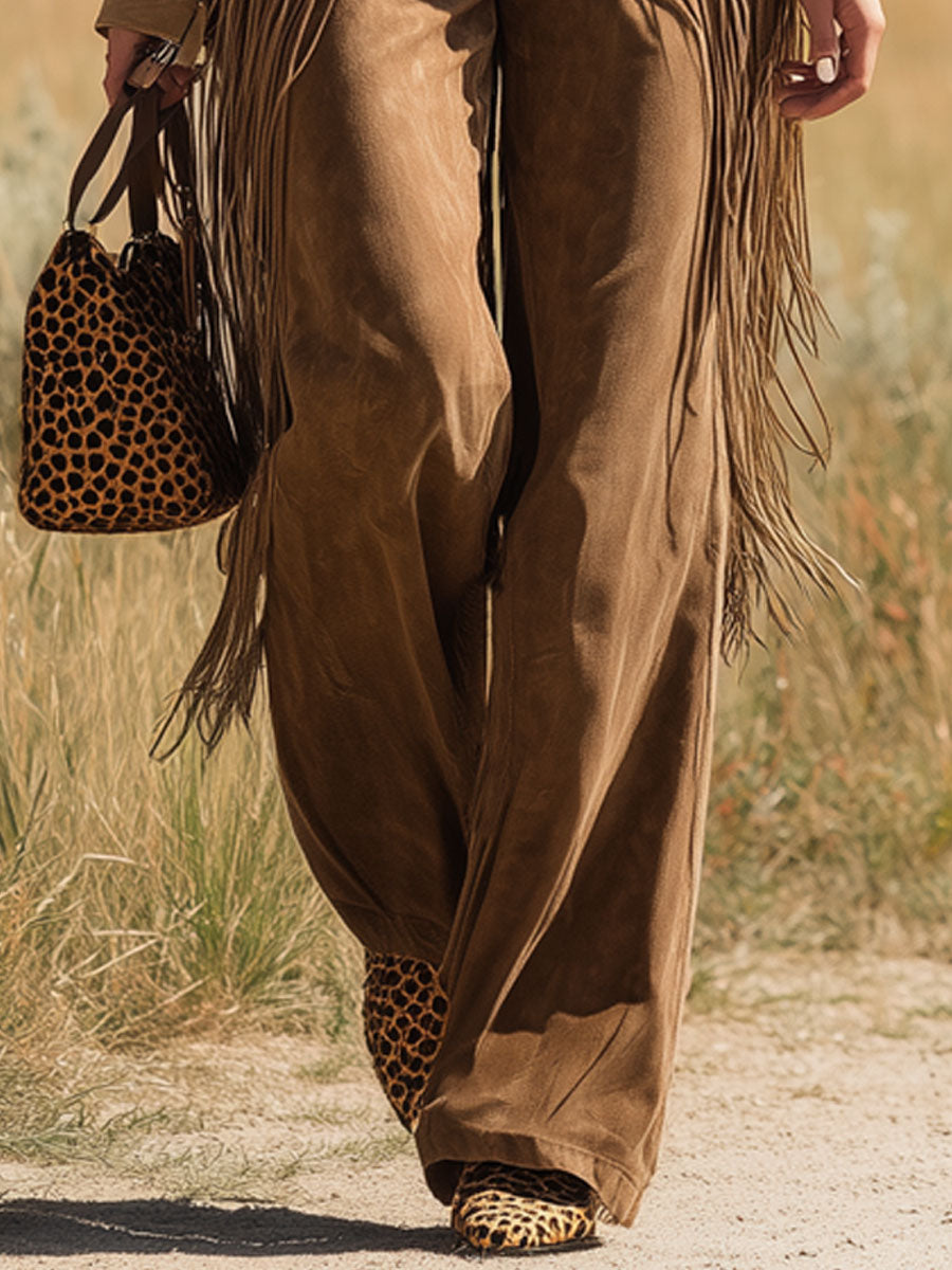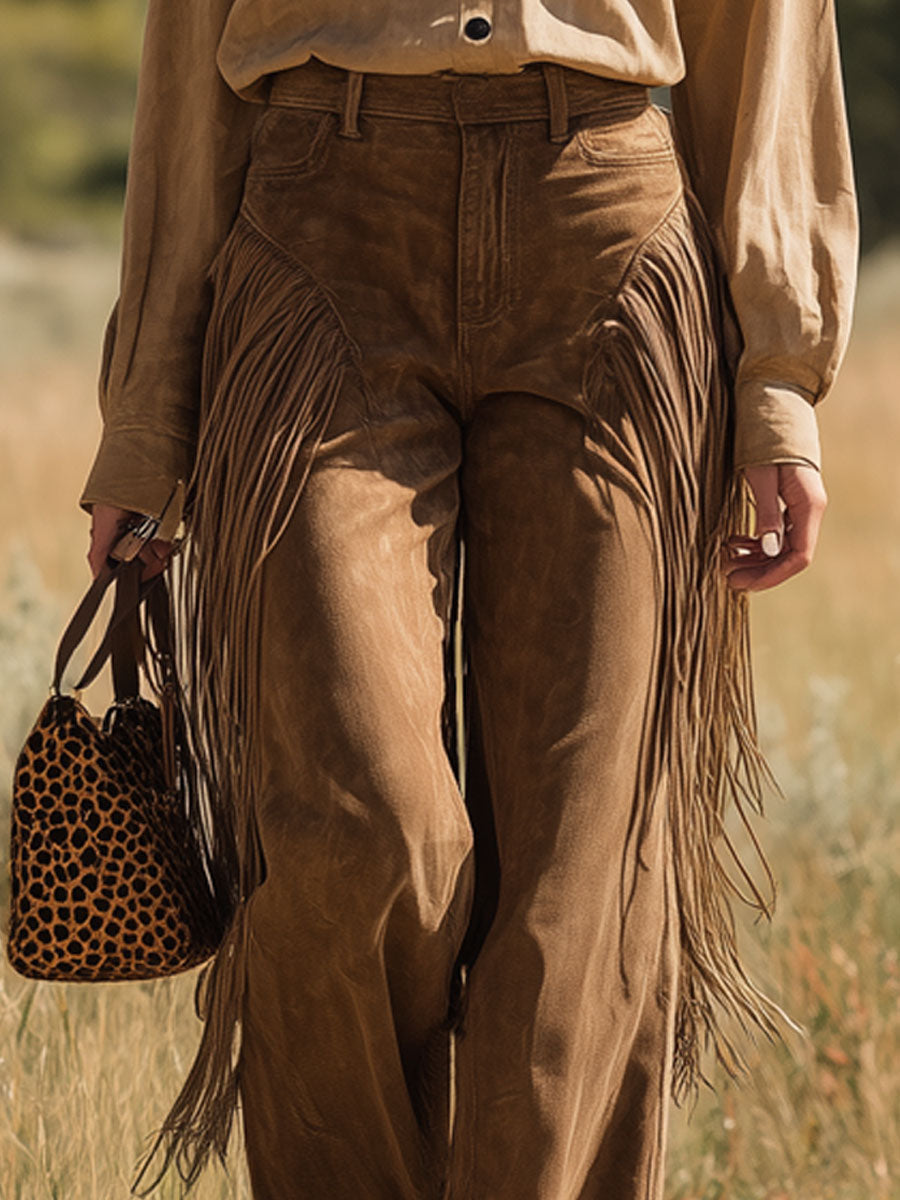 The Western Vintage Tassel Camel Wide-Leg Jeans feature a relaxed, wide-leg silhouette crafted from soft camel-toned denim, blending retro Western style with modern comfort. Highlighted by playful tassel details, these jeans add a unique and stylish touch that sets them apart from classic denim. The high waist and roomy cut offer both flattering shape and ease of movement, making them perfect for a laid-back yet fashionable look.